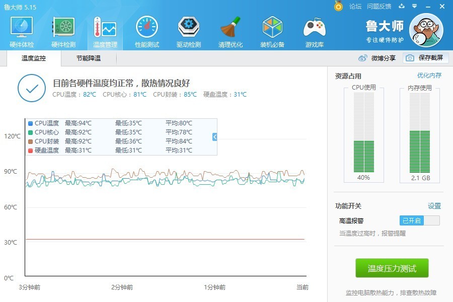 撸大师性能测试时CPU出现过热降频,也就是说散热能力连撸大师性能测试都过不了。撸大师温度压力测试刚开始温度轻松破90,测试1分钟后CPU从3GHz降频到2.3GHz,测试3分钟温度稳定在75-84℃。所以因为散热能力差,限制了CPU长时间高强度工作的可能性,综合性能大打折扣,别看天梯图上八代i5排名多高,散热不行无用武之地。