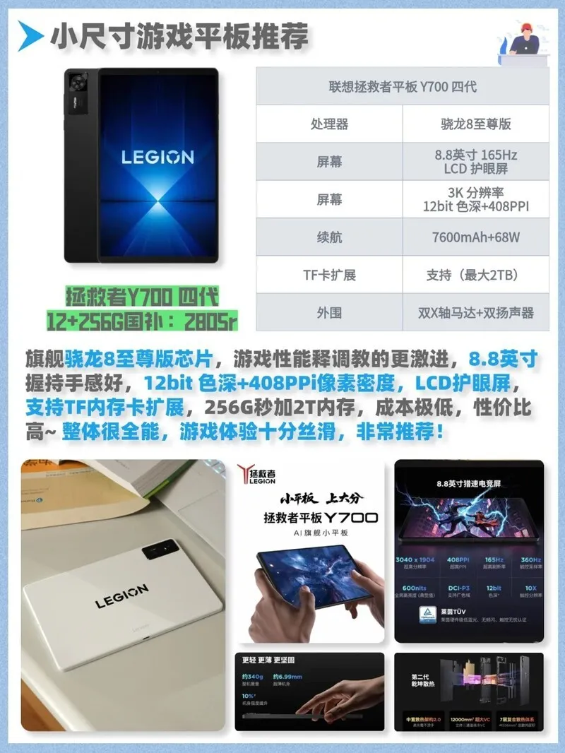 LCD护眼屏,408PPi像素密度最高,屏幕很清晰,8.8英寸握持手感不错!骁龙8至尊版处理器,相对来说它的游戏性能释放来的更激进,玩游戏的时候帧率很稳,加上官方G9手柄,秒变一台大尺寸掌机~ 续航调教不错,玩游戏时释放强,但日常使用的时候又非常侧重省电的策略,4款中唯一支持TF内存卡扩展的,没有内存焦虑。