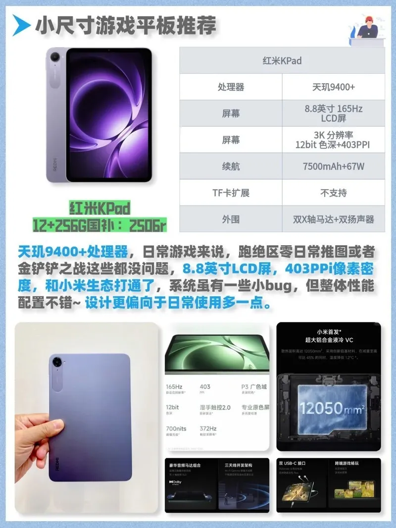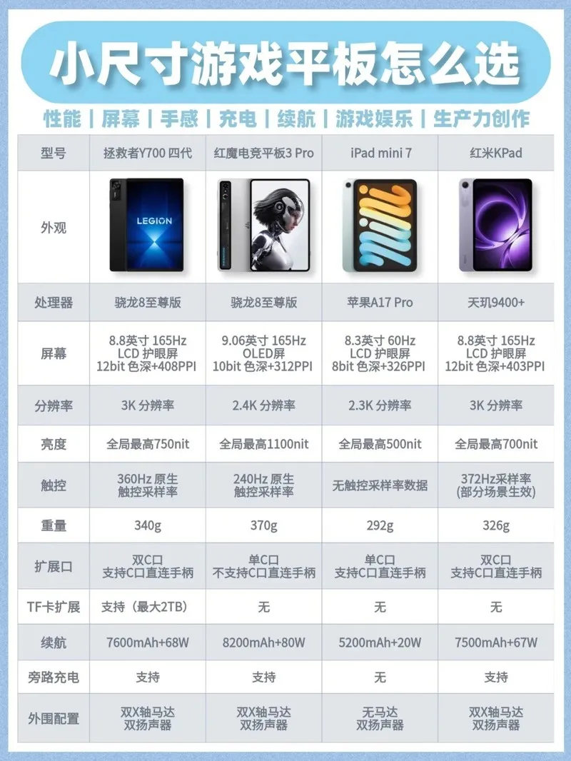 想要一款手感好、玩游戏方便、又可以随身携带的平板,到底该怎么选?今天分享四款市面上主流的小尺寸平板,希望对你的选购能有所帮助~具体测试内容可以看后面几张图。
