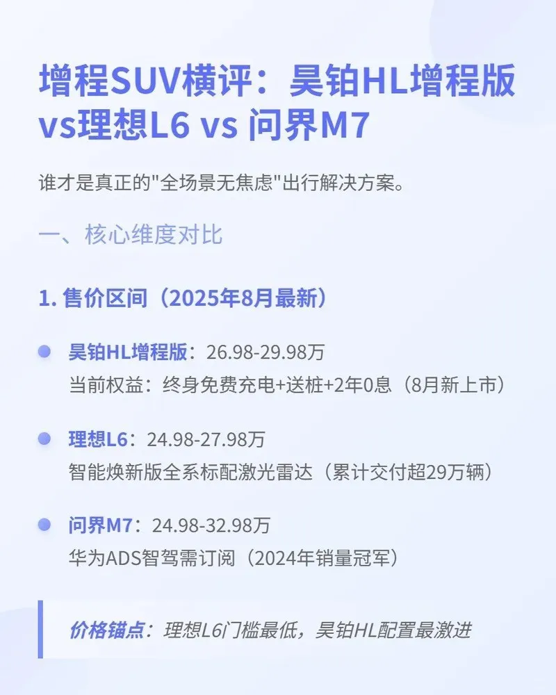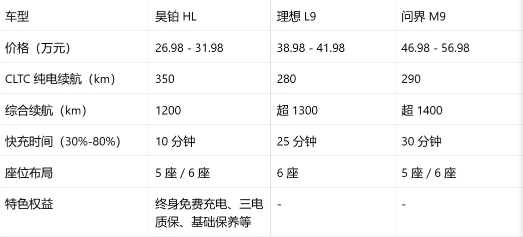 昊铂HL增程版8月19日正式上市啦,从空间看,昊铂 HL 轴距 3088mm,车长 5126mm;理想 L9 轴距 3105mm,车长 5218mm;问界 M9 轴距 3110mm,车长 5230mm,都很宽敞。但昊铂 HL 有 5 座版,布局更灵活。功能上,昊铂 HL 有双零重力座椅、紫外线杀菌冷暖箱等;理想 L9 和问界 M9 配置也丰富,不过昊铂 HL 部分功能是标配。补能时,昊铂 HL 的 800V 高压平台和 5C 超快充技术很突出,理想 L9 和问界 M9 逊色不少。这么看,昊铂 HL 性价比高,这车是真懂咱们老百姓既要又要的想法,真正做到省心又省钱!#昊铂 #好友玩昊车#昊铂HL增程版26万98起