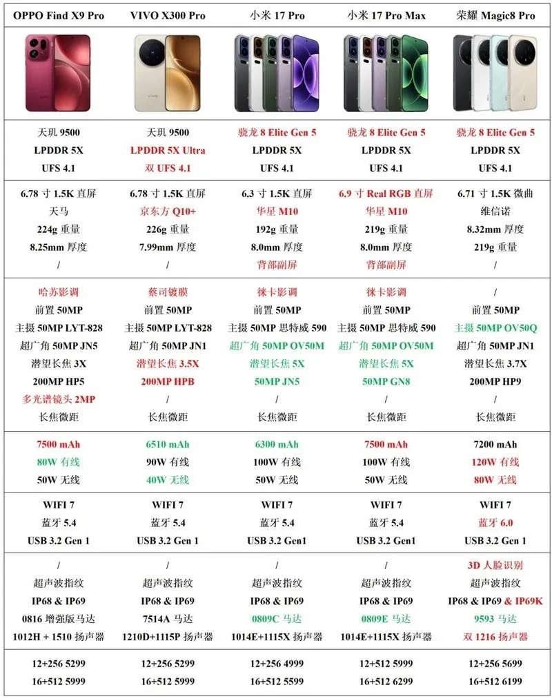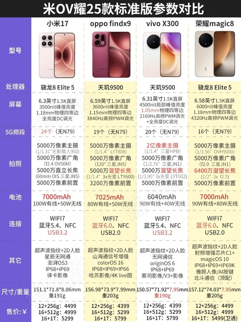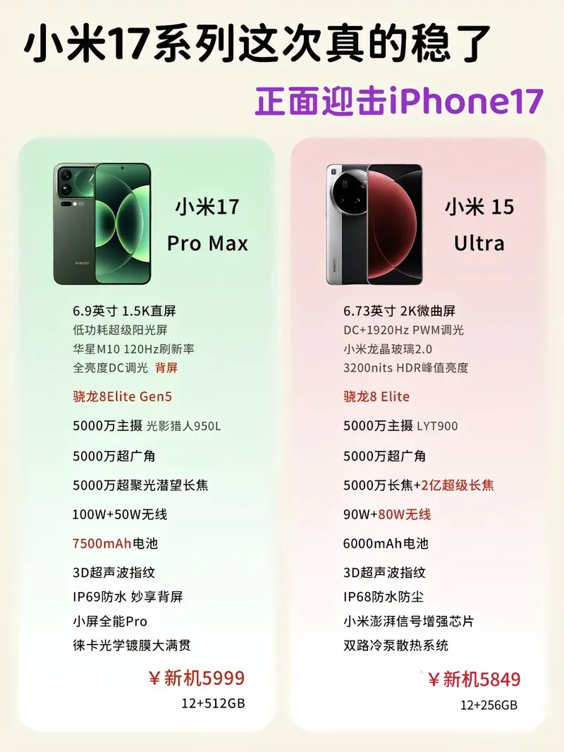 - 小米17:性能续航小屏王者。骁龙8 至尊版 Gen5性能强,7000mAh电池+100W充电最快,适合追求极致性能与续航的小屏用户。