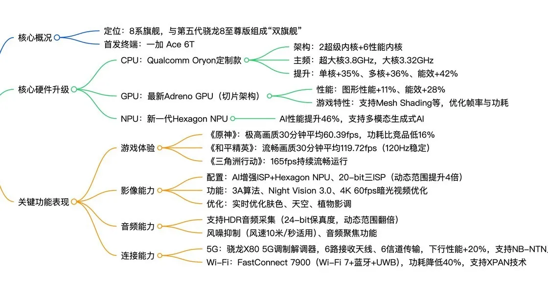 一加Ace6T选择首发第五代骁龙8。它不是用一两个卖点吸引注意,而是从旗舰芯片的底层能力开始,去构建一台在高负载、长时间、复杂交互场景下都能稳定输出的性能手机。 第五代骁龙8本身就是一次幅度极大的旗舰升级。全新的定制OryonCPU带来了35%单核、36%多核的提升,同时能效提高42%,GPU在保持高频稳定的情况下又拿到11%性能增幅,NPU更是提升46%。 这意味着Ace6T在大型游戏、生成式AI、本地计算和后台重任务中,不仅更快,也能更久地保持高性能,不会因能耗压力出现常见的降频波动。性能上限更高、能效更稳,这也是Ace6T体验的基础。一加在这一代更关键的价值,是不把芯