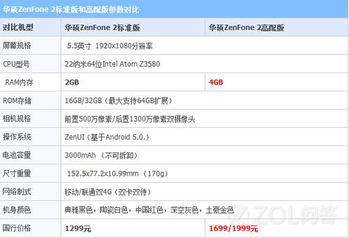 通过华硕ZenFone 2标准版和高配版两个版本的参数对比可以看出,除了价格不一样外,华硕ZenFone 2标准版和高配版硬件配置基本没有任何区别。那么这两款机型到底为什么差价400元呢?这个主要在两内存上,华硕ZenFone 2高配版比标准版高2GB,更大的内存将带来整机更高的流畅度(不过实际能提升多少只有使用后才知道)。