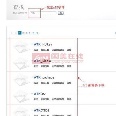 华硕笔记本的Fn热键驱动名称叫ATK,到华硕官网上可以找到,进入官网后,直接搜索ATK即可。但这里需要说明的是,ATK共有五个驱动,这五个都需要安装。如果只安装其中一个或部分安装,则有可能导致热键不管用或部分不管用。