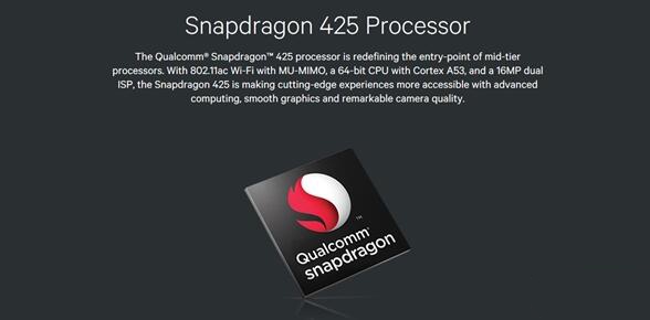 高通骁龙425是最近新推出的一款入门处理器,骁龙425采用四核心Cortex-A53架构设计,基于28nm LP工艺制造,主频1.4GHz,GPU为Adreno 308,最高支持1600万像素摄像头以及1280×800分辨率显示屏,集成X6 LTE基带(LTE Cat.4全网通)。
