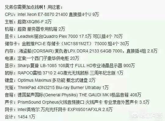 最重要是这个电脑是用来干什么用?如果单单玩游戏,2万以上属于糟蹋钱。如果用来视频游戏特效编辑,至少得5万。如果用来网络运营,一百万以上的服务器也有...