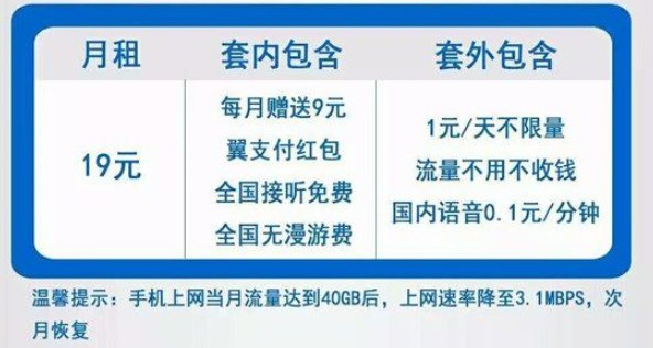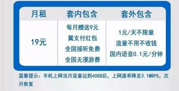 电信王中王卡的月租为19元,加上每天1元流量费,也就是说,封顶不超过50元!跟联通腾讯大王卡资费相当。当手机上网流量达到40GB后,上网速率降至3.1Mbps,大约400KB/s。不过,以小编的经验看,我们每月所有的上网流量几乎很难超过40GB,除非你是影视迷……另外,此卡每月赠送9元翼支付红包,连续送一年,折算下来每月资费仅40元,可是相当划算的。