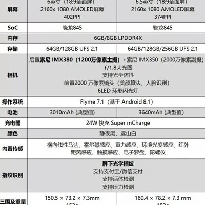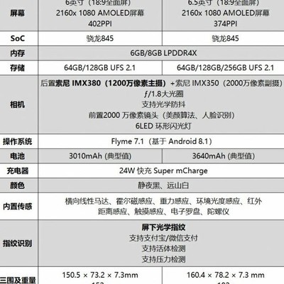 硬件配置方面,魅族16th系列机型搭载了骁龙845处理器,6GB/8GB内存,屏幕为6.0英寸/6.5英寸,采用了非刘海全面屏,配置屏下指纹,屏占比达91.18%,机身薄7.3mm,后置1200万+2000万像素双摄像头,配置IMX380传感器,前置2000万像素自拍镜头,电池容量3010mAh/3640mAh,采用液冷散热,mEngine触感引擎。