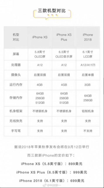 Quick Mobile 5.8英寸OLED iPhone的名称定为Xs,而6.5英寸OLED iPhone的名字除了Xs Max之外中间还有Plus,6.1寸LCD iPhone命名为iPhone 9。当然,这些只是Quick Mobile自己的猜测而已。