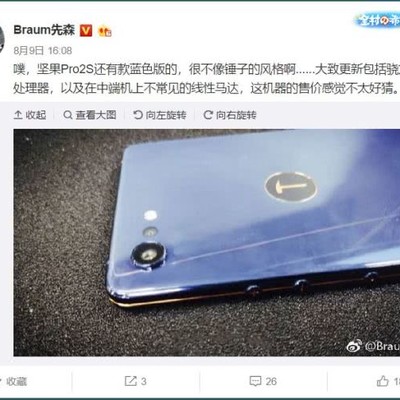 根据爆料,坚果 Pro 2S将采用高通骁龙 710 处理器,摄像头方面:后置 1200 万+500 万像素双摄组合,前置1600 万摄像头,其他信息未知。你期待这款升级版本的坚果PRO2S吗?