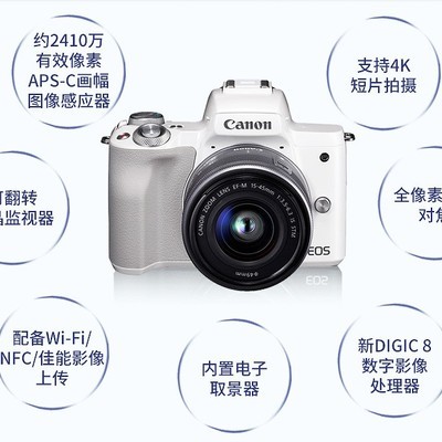 Canon EOS M50在机身尺寸上要略大于EOS M100/M5,达到了116.3 ×88.1 ×58.7mm,外观也更加专业范儿,颇有缩小版的80D既视感。黑色/白色的经典双色搭配任君选择,也算是佳能在入门机型上的特色了。而在最重要的CMOS上,佳能给EOS M50上了一块全新的2410万像素的APS-C画幅CMOS传感器,支持全像素双核AF,AF范围扩大约38%。对焦系统则采用了143点对比度自动对焦,快门速度1/4000~30s,支持纯电子快门。而性能更为强劲的Digic 8处理器则带来了4K 25p / 24p, FHD 60p与HD分辨率(720p)下120p的视频拍摄能力,以及最高10fps的连拍速度。