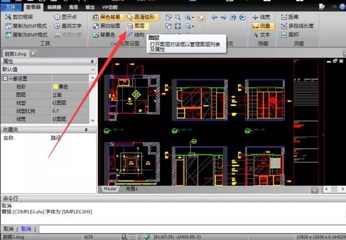 第三步:将需要进行修改的线型图层找到之后,在软件的最上方菜单属性中点击查看器——图层,然后点击激活该功能属性即可。