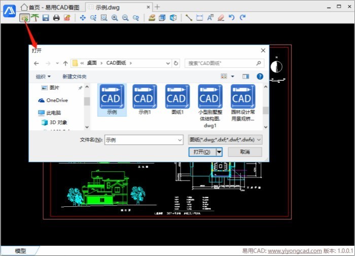 2.启动运行易用CAD看图软件,点 击菜单栏里的【打开文件】图标,会弹出【打开】弹窗,在打开弹窗中我们选择需要的CAD图纸打开即 可。