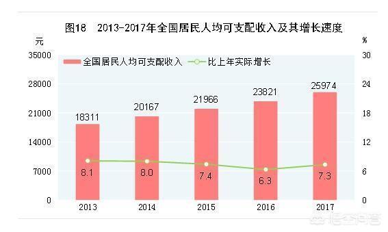 根据国家统计局网站公布经济数据:2017年,全国居民人均可支配收入25974元,比上年名义增长9.0%,扣除价格因素,实际增长7.3%。