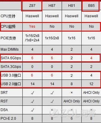 Z87主板和B85主板的芯片组性能参数上主要区别在于Z87支持超频,支持SLI或CF,支持RAID,接口也丰富,而B85不支持超频,不支持CF或SLI,不支持RAID,接口较少。在生产厂家的产品上区别主要在于用料和价格上,Z87做工用料丰富,供电设计也更适合超频,而B85正相反。
