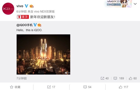 2月12日消息,春节假期刚过,vivo就开始搞事情了。今天早间,vivo官方微博转发了一条名为“iQOO手机”的微博,称“新年欢迎新朋友”。据求证,“iQOO手机”将是vivo的一个全新子品牌。