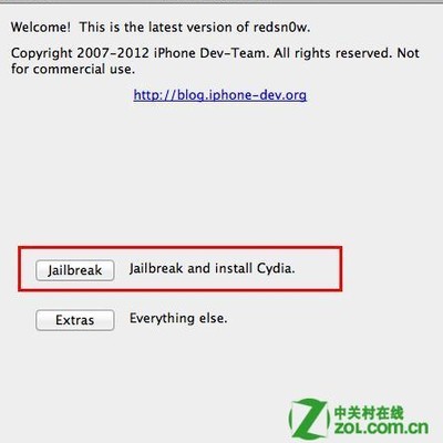 启动Redsn0w,选择“越狱(Jailbreak)”,然后选择“安装Cydia (Install Cydia)”。