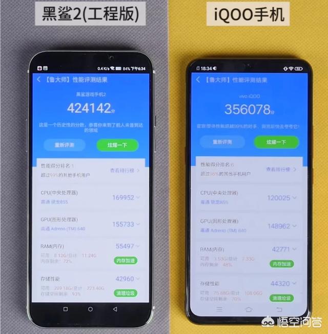 从性能配置上看,IQOO搭载的骁龙855处理器,安兔兔跑分在37万左右。手机好不好,做过对比才知道,拿IQOO和小米9做对比,尽管两者都使用的是骁龙855处理器,但是iQOO的3DMark分数就要比小米9高7%左右,说明vivo对IQOO系统和SOC协调的优化更加棒一些。满帧玩游戏半小时发现,IQOO温度比小米9低了5度,看来这方面iQOO也稍占优势。
