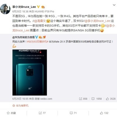 此外,华为手机产品线副总裁李小龙表示,华为Mate 20 X 5G还是唯一一款支持双卡的5G手机(支持一张5G、一张4G),其它5G芯片平台都不支持双卡。