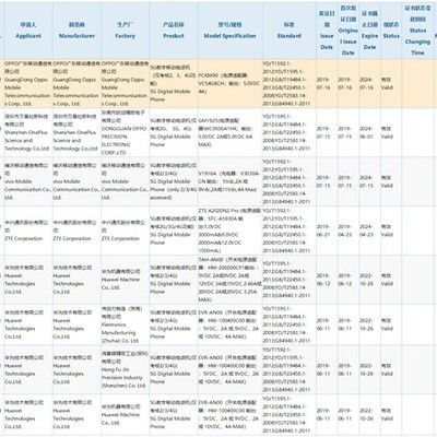 5G手机距离上市越来越近了!中国3C质量认证中心信息查询显示,目前已有八款手机通过了国家的3C认证,包括华为四款,中兴、一加、OPPO、vivo各一款。