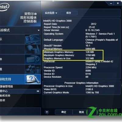 如图所示,Minimum Graphics Memory:128M表示我的HD Graphics 3000核心显卡最少会占用128 MB的内存作为显存,Maximum Graphics Memory:1760MB表示我的HD Graphics 3000核心显卡最多会占用1760 MB的内存作为显存,当前已经占用的内存是332MB。