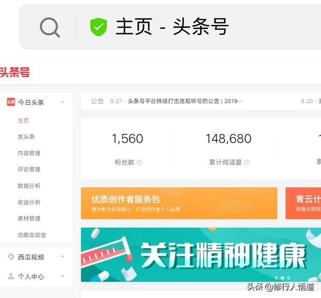 注册完后你在头条号上创作的作品都可以在头条上看到,自己也可以在个人中心看到“创作管理”了(记住!发布作品要在头条号上发布,这样你发布的信息有一定流量后就可以产生收益了,如果希望自己收益提高那就发挥你的创作能力,创作更优秀的作品开通原创吧)