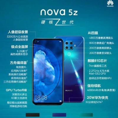 Nova 5z,这款手机其实就是Nova 5iPro的孪生兄弟,长得一模一样不说,配置也是一样的,但是价格便宜了一些,目前官价6+64版本的1499元。这款手机就是华为专为双十一这类活动推出的线上版本,为了和竞争对手硬扛,性价比是非常不错,麒麟810处理器,性能绝对是够用,作为Nova系列,自然颜值和拍照让人放心,所以这款手机性价比超过荣耀9x,而且是20w快充,少了这个槽点之后,5z的整体相对来说比较均衡了。