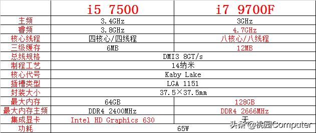 i5 7500 和 i7 9700f,是英特尔旗下的两款处理器,二者在售价方面相差了1千元左右,在性能方面也有着不小的差异,笔者把详细参数整理了一下,以供参考: