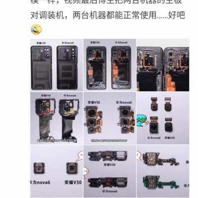 来自微博@艾奥科技 的荣耀V30和华为nova6拆机对比视频,两台机器的内部结构几乎一模一样,视频最后博主把两台机器的主板对调装机,两台机器都能正常使用!