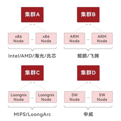 而在CPU架构的异构方面,相比于长期以来x86架构CPU一统江湖的局面,近几年,世界上主流的互联网公司,基本上都在使用ARM、RISC-V等非x86架构的CPU作为新的算力来源。在信创方面,CPU架构的异构更具特别意义。现今信创CPU技术路线较多,分为x86、ARM、LoongArch、Alpha四条路线,还有不断发展的RISC-V将来也可能异军突起。