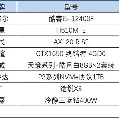 根据你的要求配置单如下,12400F套装和双8G内存是必备,显卡可选的起色并不多,千元的话1650算是性价比比较高的产品了。