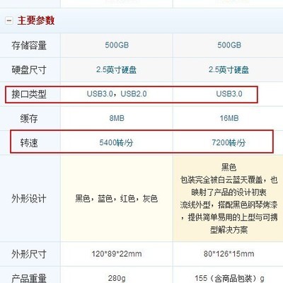 如果是USB 2.0的标准就选5400转的移动硬盘,如果是USB 3.0的标准选7200转的移动硬盘还是能在一定程度上体现出差别来,5400转的移动硬盘与7200转的移动盘在写入数据的时候大约会相差10MB/S的差距,需要注意的是如果是USB 3.0的移动硬盘在主机上必须有对应的USB 3.0的接口才可以,USB 3.0的移动硬盘插在USB 2.0的接口上是无法体现USB 3.0的性能的。