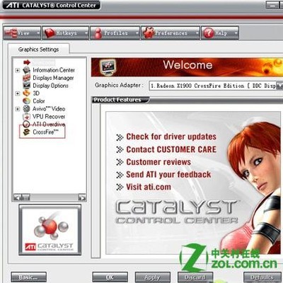 进入催化剂控制中心的主界面后,我们会发现在左侧列表的最下端“CrossFire”赫然在目,不用犹豫,就点它。