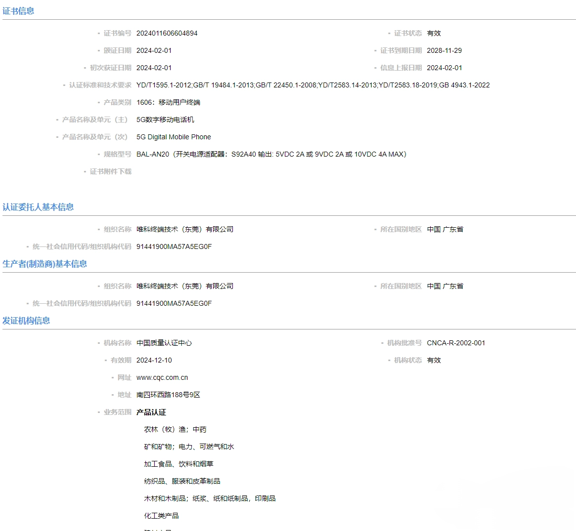 华为智选手机品牌WIKO近日有一款新机通过了国家3C质量认证。这款型号为BAL-AN20的手机由惠州光弘科技代工,并标配S92A40充电器,支持40W充电。虽然目前关于该手机的详细参数还不清楚,且未通过工信部入网认证和无线电核准,但预计其将是一款新一代的畅享系列手机。