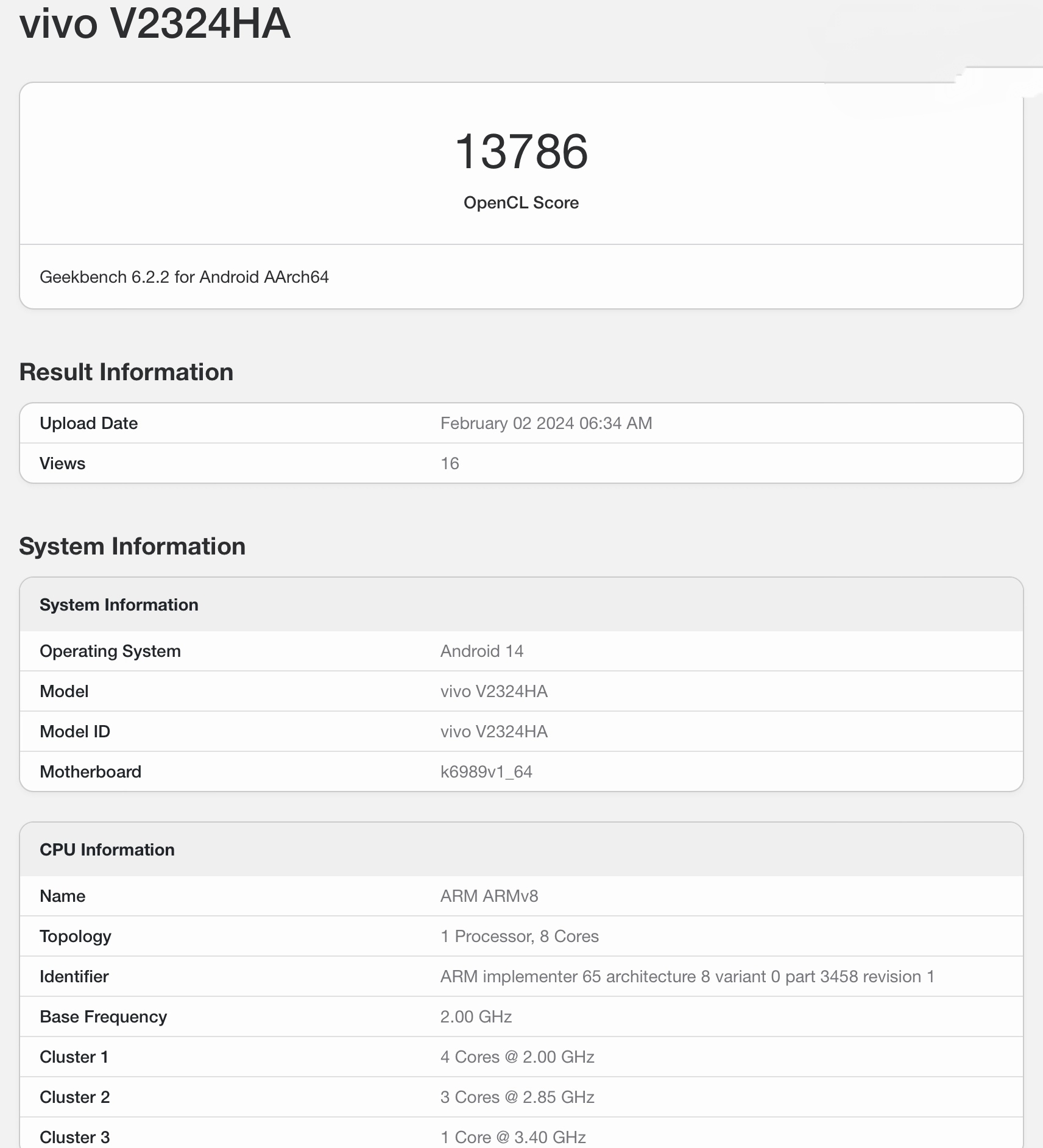 vivo V2324HA 手机现身 Geekbench 数据库,首曝天玑 9300+ 处理器规格信息,其超大核频率由天玑 9300 的 3.25GHz 提升至 3.40GHz,其余规格保持不变。