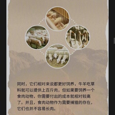 同时,它们相对来说都更好饲养,牛羊吃草料就可以提供上百斤肉,但如果要饲养一个食肉动物,你需要付出的成本就相对较高了。并且,食肉动物作为需要捕猎的存在,它们也并不容易长肉。