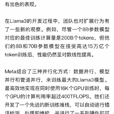 首批发布的Llama3 8B和Llama3 70B包括预训练和指令微调版本,8K上下文,在两个24K GPU定制集群上使用15万亿tokens数据训练而成,Meta称它们分别是80亿和700亿参数上最好的模型。同时一个参数超过400B的“最大Llama3”也在训练中,社区认为这个模型更恐怖,极有可能超过当前的闭源王者GPT-4 Turbo。