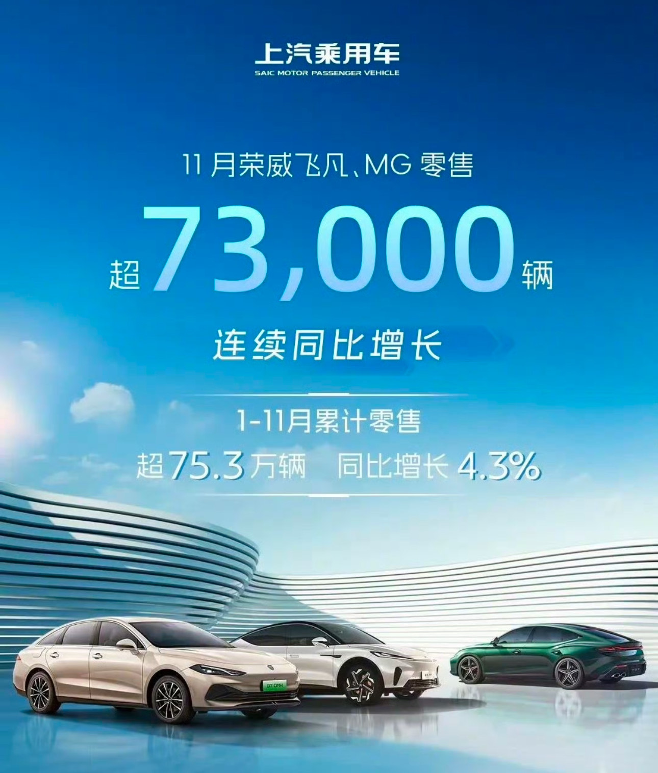 汽乘用车发文宣布:11 月荣威飞凡、MG 零售超 7.3 万辆,实现连续同比增长;1-11 月累计零售超 75.3 万辆,同比增长 4.3%。