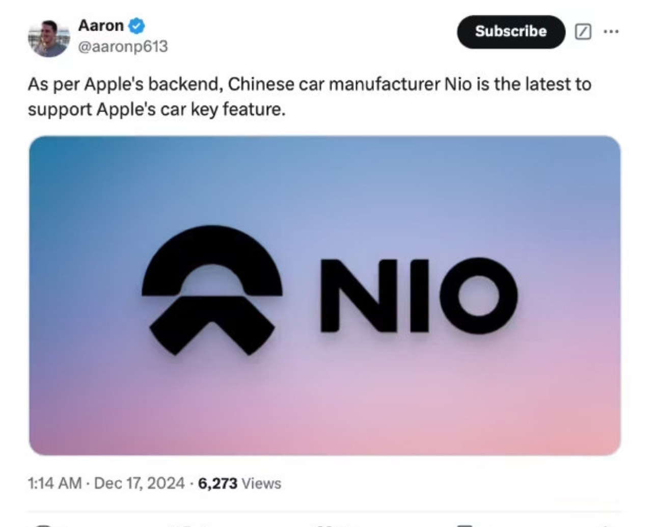 声称蔚来有望支持苹果钱包应用的数字车钥匙(Car Key)功能,不过其尚未公布更多细节。