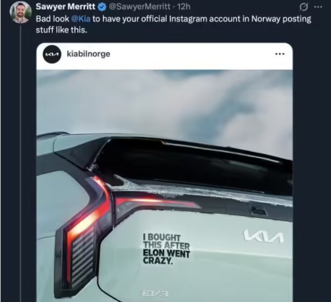 该帖子的内容是一张起亚 EV3 车尾的照片,上面贴着一张写有“埃隆疯了之后我买了这辆车”的贴纸。这种贴纸在部分对马斯克感到失望的特斯拉车主中较为常见,原因在于他们对马斯克愈发浓重的政治倾向以及他在“政府效率部门”(DOGE)的工作感到不满。然而,起亚挪威的这一举动却引发了争议,众多特斯拉支持者和特斯拉员工纷纷对该帖子表示批评,认为其行为令人失望。