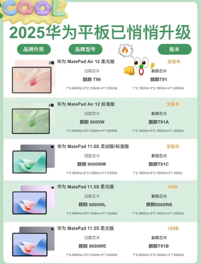 华为MatePad Air12标准版、柔光版、华为MatePad 11.5S标准版、灵动版、柔光版在今年生产时悄悄更换了芯片宝子们注意到了嘛薇子今天带宝子们看看这些平板都有哪些升级呢?