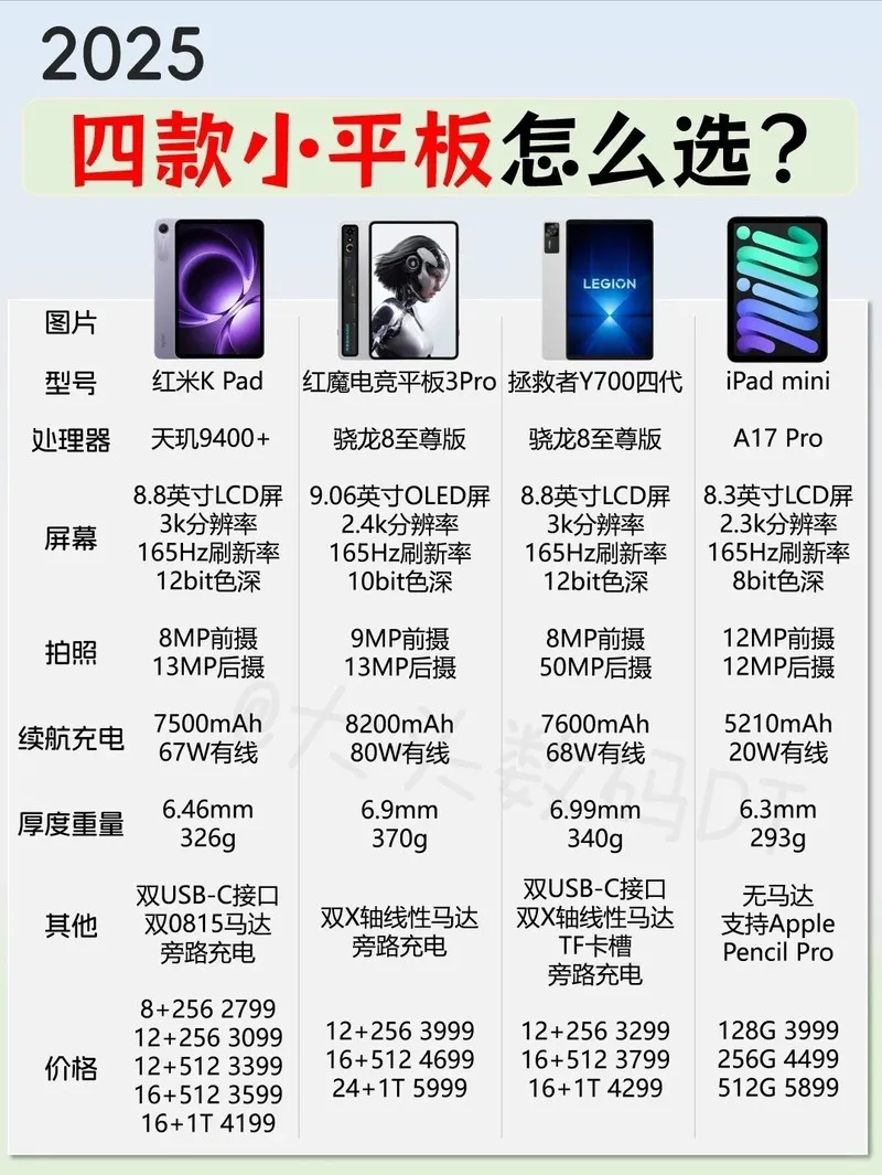 现在四款小平板:红米K Pad、红魔电竞平板3Pro、拯救者Y700四代、iPad mini7,你会选择哪个?