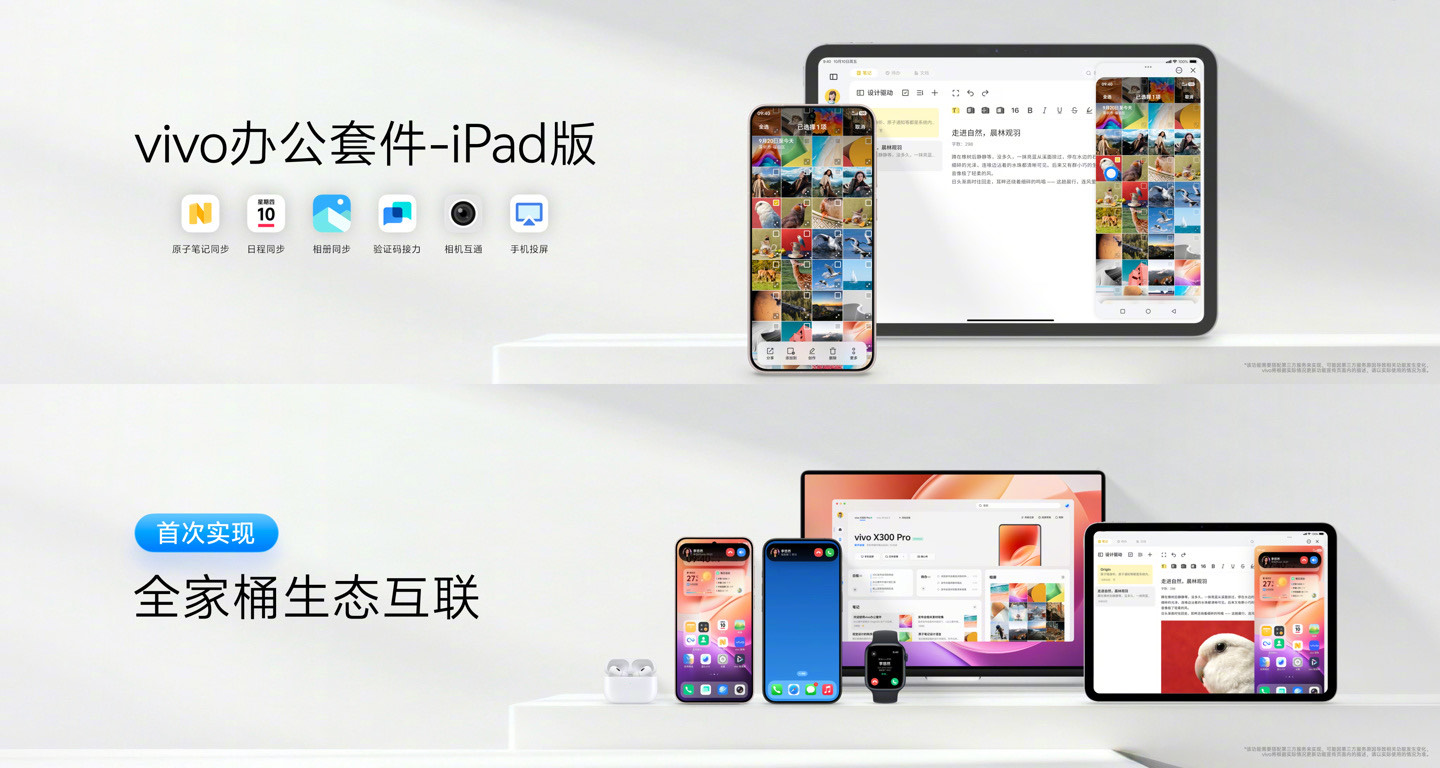 从官方预告图来看,vivo 办公套件 iPad 版支持原子笔记、日程、相册的同步,以及验证码接力、相机互通、手机投屏等功能,并且首次实现了与苹果全家桶的生态互联。据IT之家了解,vivo 在此之前已经支持和 Mac、iPhone、AirPods、Apple Watch 实现跨生态体验。