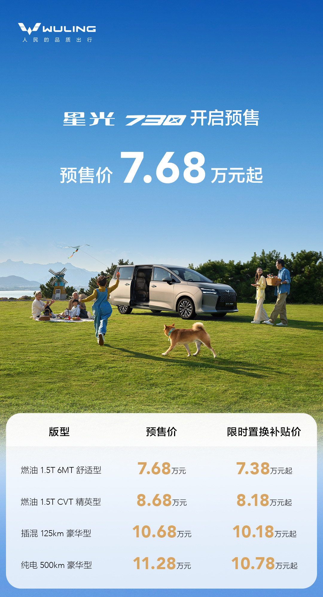 五菱星光 730 今天正式开启预售,新车定位为“全能舒享大 7 座”MPV,共推出四款车型配置:插混 125km 豪华型、纯电 500km 豪华型、燃油 1.5T CVT 精英型、燃油 1.5T 6MT 舒适型,预售价为 7.68 万元-11.28 万元,限时置换补贴价为 7.38 万元-10.78 万元。