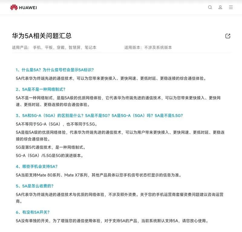 据了解,目前,华为Mate 80系列、华为Mate X7系列率先支持5A。