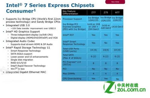 Z77和H77的板子,最大的区别就是Z77的主板支持ivy bridge的K系列处理器,可支持超频,而H77的主板则不能支持K系列的可超频处理器,然后就是Ivy Bridge PCI Express Graohics插槽的数量上,H77的主板只有一个,Z77根据不同价位有多个。