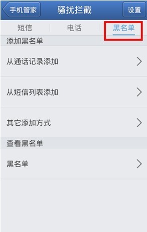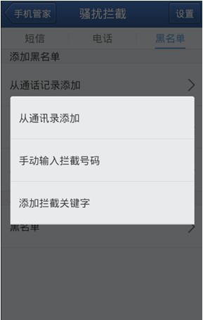 3. 在黑名单中,大家可以自行添加号码进行拦截,在“其它添加方式”中还可以手动三种添加方式: