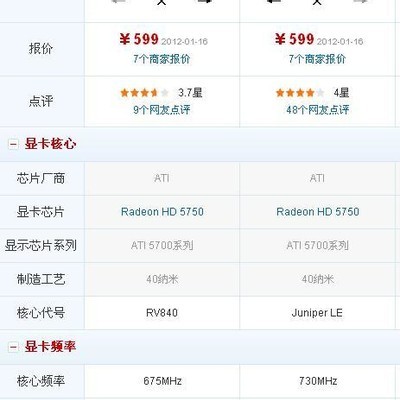 两款显卡的性能和参数很接近,不过,相同的599元的价格下镭风 HD5750悍甲蜥2代 512MB性能更强一些,性价比最高,下图是两款显卡的对比图。从对比中我们可以看出,镭风 HD5750悍甲蜥2代 512MB显卡的核心频率和显存频率都比铭瑄显卡高出不少,此号该显卡还具备shader model 4.1的3D特性,使得游戏的渲染更加真实。不过两款显卡比较老了,如果购买很可能需要从二手市场中购得。