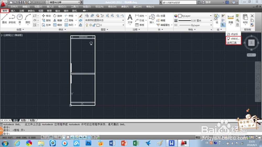 1.1.启动AutoCAD2012软件,按Ctrl+O组合键打开一个图形文件。在“功能区”选项板的“常用”选项卡中,单击“实用工具”按钮,在打开的下拉菜单中,选择“点样式”选项,打开点样式对话框,选择自己想设置的图案。