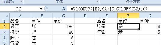 6. 由于不是单独查找一个值,其它的返回值也要用公式,此时就要向右向下填充公式,右拉时,查找值必须保持在E列,就要对E列用绝对引用,表区域,必须在A:C列,同样也要绝对引用,而下拉时,查找值是随行号变化的,所以行号不能用绝对引用,这样的引用就为混合引用,而单位和单价返回的列不同,所以数字2不能固定,用COLUMN(B2)来替换,右拉时就会变成COLUMN(C2),这里的B2行列都没固定(当然这里是取列标,行号也可以固定),这种引用就为相对引用,如上图公式改为:=VLOOKUP($E2,$A:$C,COLUMN(B2),0),就可直接右拉下拉填充公式。